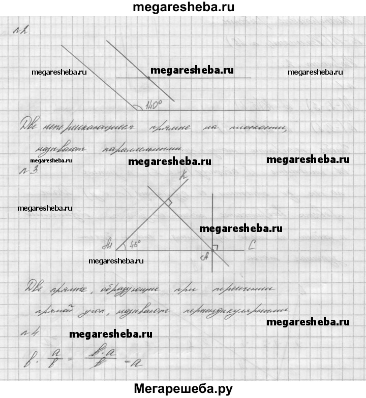 1. На координатной плоскости проведите прямую MN через точки М (-4; -2) и N (5; 4) и отрезок KD, соединяющий точки К (-9; 4) и D (-6; -8). Найдите координаты точки пересечения отрезка KD и прямой MN. 2. Постройте угол, равный 140°. Отметьте внутри этого угла точку и проведите через нее прямые, параллельные сторонам угла. 3. Постройте угол СМК, равный 45°. Отметьте на стороне МС точку А и проведите через нее прямые, перпендикулярные сторонам угла СМ К. 4. Делимое равно а, а делитель равен b (а и b не равны нулю). Чему будет равно произведение делителя и частного этих чисел?