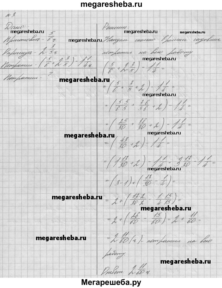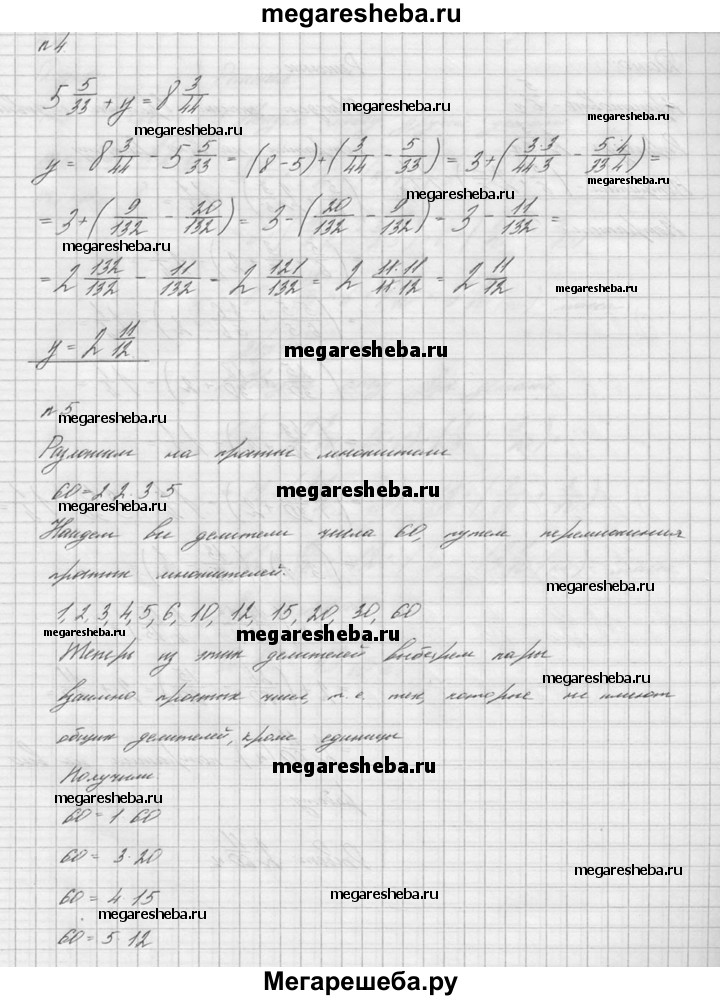 1. Найдите значение выражения: а) 3*5/8 + 1*2/3 б) 4*49 – 2*5/6 в) 6*7/12 + (5*3/40 – 4*8/15). 2. Масса одной детали 5*4/5 кг, что меньше массы другой детали на 1*1/2 кг. Какова масса двух деталей вместе? 3. Садовник рассчитывал за 5/6 ч приготовить раствор и за 2*3/5 ч опрыснуть этим раствором деревья. Однако на всю работу он потратил на 1*1/4 ч меньше, чем рассчитывал. Сколько времени ушло у садовника на всю эту работу? 4. Решите уравнение 5*5/33 + у = 8*3/44. 5. Разложите число 60 на два взаимно простых множителя четырьмя различными способами (разложения, отличающиеся только порядком множителей, считать за один способ).