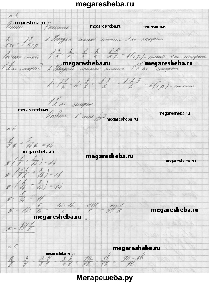1. Выполните действия: а) 1*7/9 : 2*2/3 б) 3*3/5 : 2*1/10 в) 3*3/8 : 1/8 – 1*5/14 * 7. 2. За два часа самолет пролетел 1020 км. За первый час он пролетел 8/9 того пути, который он пролетел во второй час. Сколько километров пролетел самолет в каждый из этих двух часов? 3. За 2/5 кг конфет заплатили 1*3/5 тыс. рублей. Сколько стоят 2*1/2 кг таких конфет? 4. Решите уравнение 1/7х + 3/14х = 14. 5. Представьте в виде дроби выражение a/b – 3/7.