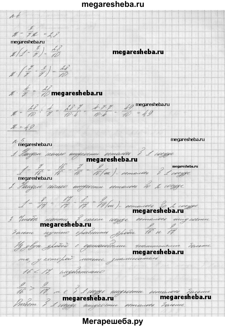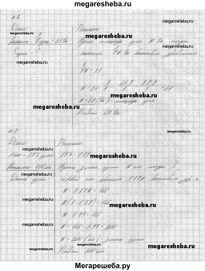1. Найдите значение выражения 3*3/8 * 4/9 + 9,45 / 5,1 – 2,8. 2. Скосили 3/7 луга. Найдите площадь луга, если скосили 21 га. 3. В первый час автомашина прошла 27% намеченного пути, после чего ей осталось пройти 146 км. Сколько километров составляет длина намеченного пути? 4. Решите уравнение х -3/7 х = 2,8. 5. Два одинаковых сосуда заполнены жидкостью. Из первого сосуда взяли 7/16 имевшейся там жидкости, а из второго 8/17 имевшейся там жидкости. В каком сосуде осталось жидкости больше?