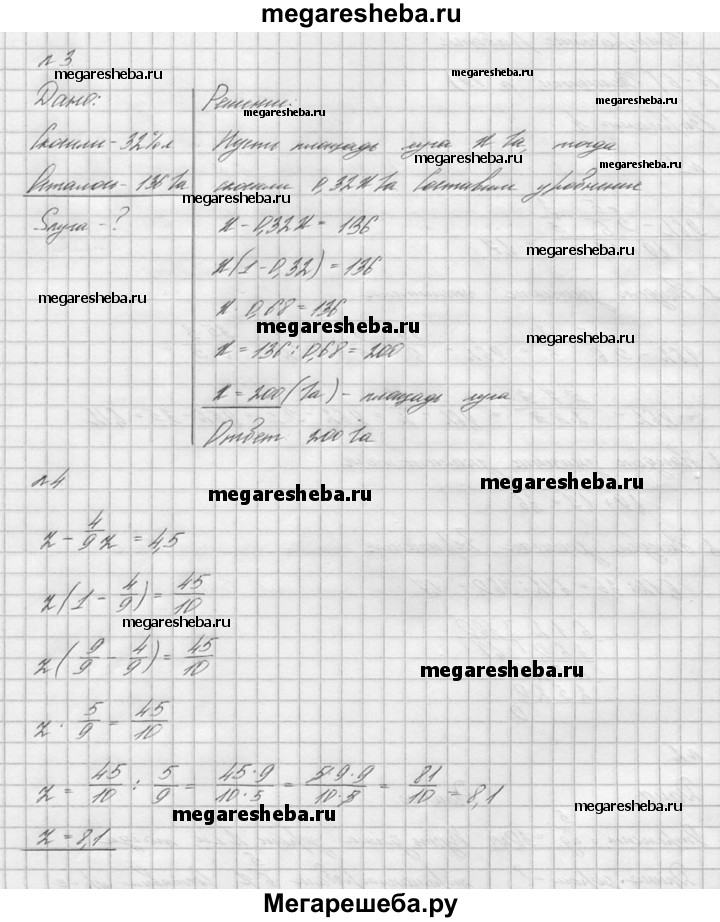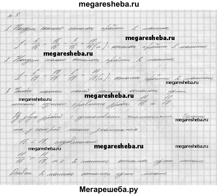 1. Найдите значение выражения 9,62 – 5*5/6 * 3/5 / 1,9 + 1,7. 2. Отремонтировали 5/6 дороги. Найдите длину всей дороги, если отремонтировали 30 км дороги. 3. Скосили 32% луга, после чего осталось скосить еще 136 га. Найдите площадь луга. 4. Решите уравнение z – 4/9z = 4,5. 5. Две автомашины должны пройти один и тот же путь. За час первая автомашина прошла 5/16 этого пути, а вторая 6/17 этого пути. Какой автомашине осталось идти меньше?