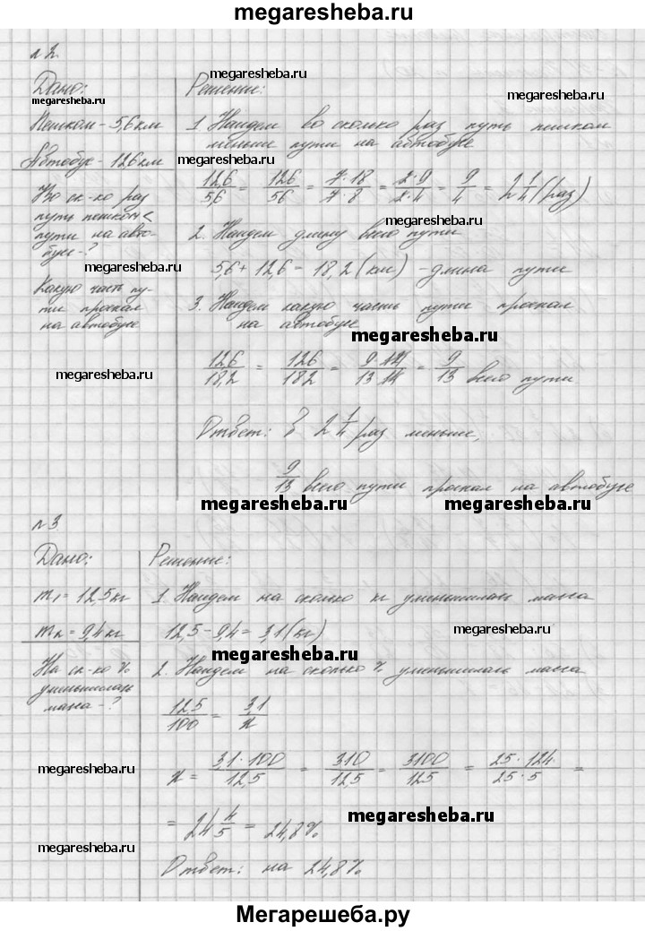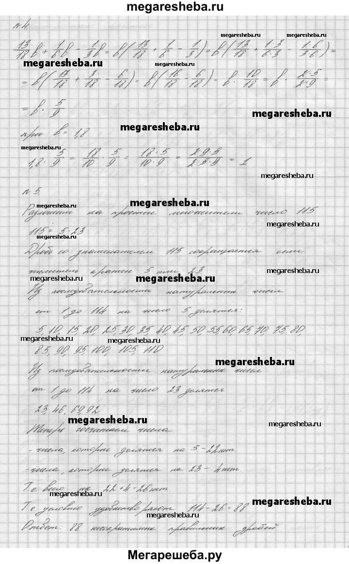 1. Найдите значение выражения: а) 24*4/5 - 19,5 : 7*2/9 б) 2,4 + 5,6 * (13*3/4 – 12*13/14). 2. Сережа прошел 5,6 км пешком и проехал 12,6 км на автобусе. Во сколько раз путь, проделанный пешком, меньше пути на автобусе? Какую часть всего пути Сережа проехал на автобусе? 3. После обработки куска дерева его масса уменьшилась с 12,5 кг до 9,4 кг. На сколько процентов уменьшилась масса этого куска дерева? 4. Упростите выражение 13/18b + 1/6b – 1/3b и найдите его значение при b = 1,8. 5. Сколько имеется несократимых правильных дробей со знаменателем 115?