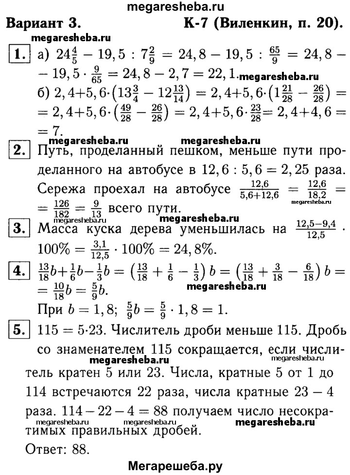 Подробный решебник (ГДЗ) по Математике за 6 (шестой) класс дидактические материалы - готовый ответ контрольная работа Виленкин К-7 - В3. Авторы учебника: Чесноков, Нешков. Издательство: Академкнига 2015-2022.