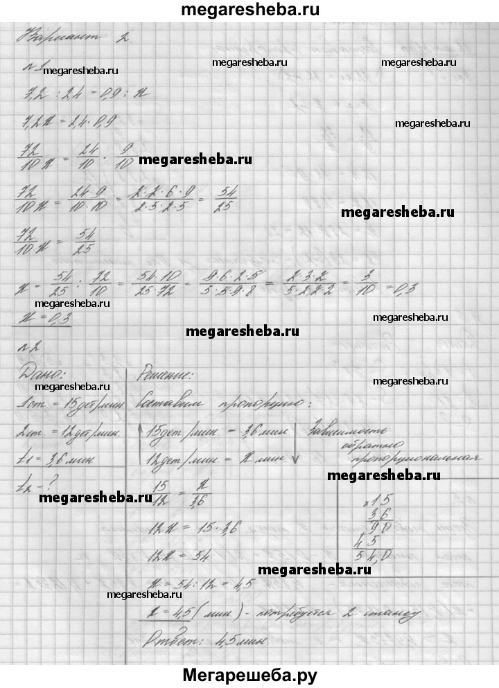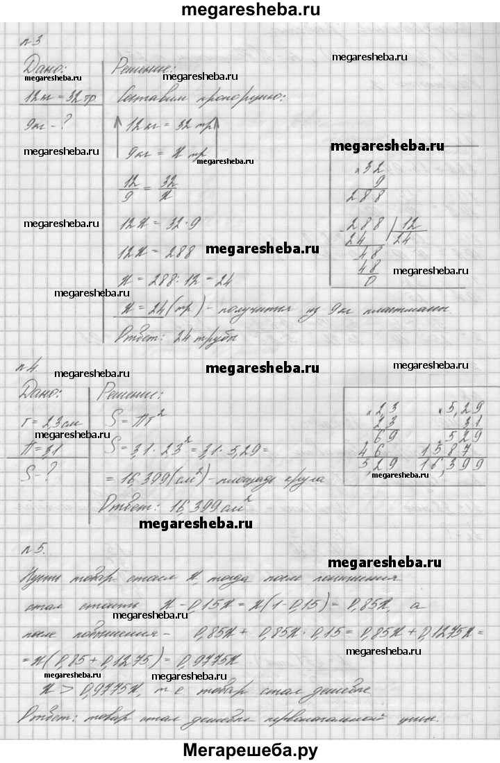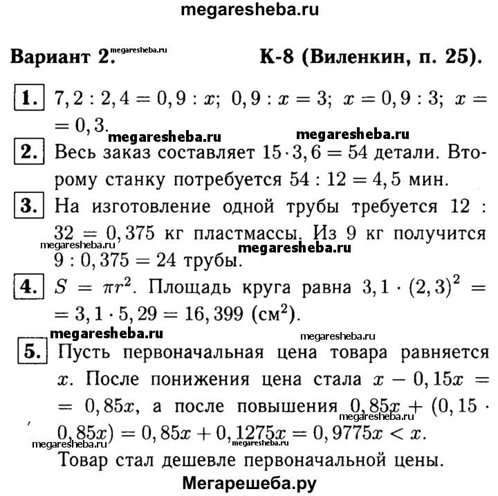 1. Решите уравнение 7,2 : 2,4 = 0,9 : х. 2. Производительность первого станка-автомата — 15 деталей в минуту, а второго станка — 12 деталей в минуту. Чтобы выполнить заказ, первому станку потребовалось 3,6 мин. Сколько минут потребуется второму станку на выполнение этого же заказа? 3. Из 12 кг пластмассы получаются 32 одинаковые трубы. Сколько таких труб получится из 9 кг пластмассы? 4. Найдите площадь круга, если его радиус 2,3 см. (Число π округлите до десятых.) 5. Сначала цена товара понизилась на 15%, а потом его новая цена повысилась на 15%. Стал товар дешевле или дороже его первоначальной цены?