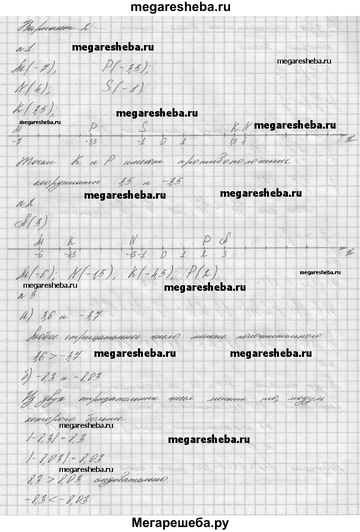 1. Отметьте на координатной прямой точки М (-7), N (4), К (3,5), Р (-3,5) и S (-1). Какие из отмеченных точек имеют противоположные координаты? 2. Отметьте на координатной прямой точку А (3), приняв за единичный отрезок длину двух клеток тетради. Отметьте на этой прямой точки М, N, К и Р, если М левее точки А на 18 клеток, N — середина отрезка AM, точка К левее точки N на 6 клеток, а Р правее точки N на 7 клеток. Найдите координаты точек М, N, К и Р. 3. Сравните числа: а) 3,6 и - 3,7 б) - 8,3 и - 8,03 в) -4/5 и -5/6. 4. Найдите значение выражения: а) | 5,4 |: | -27 |; б) | -1*3/8 |* | -2*2/11 | в) | 3,/ |: | -2*1/2 |. 5. Сколько целых чисел расположено между числами -157 и 44?