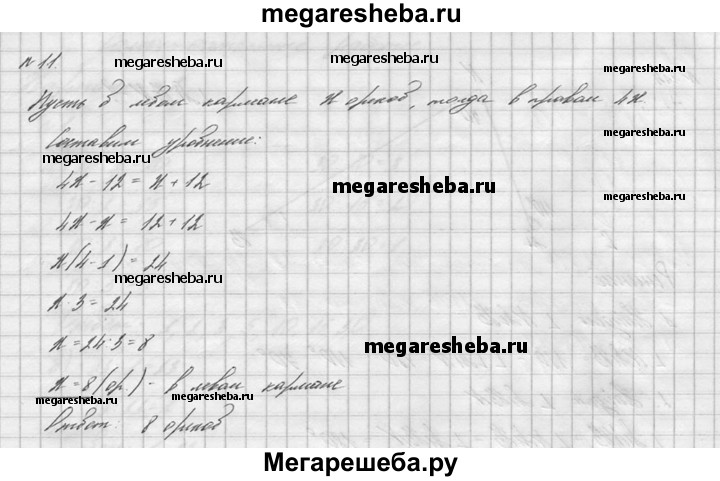 11. Составьте уравнение для решения задачи: «В правом кармане в 4 раза больше орехов, чем в левом. Если из правого кармана переложить в левый 12 орехов, то в обоих карманах орехов будет поровну. Сколько орехов было в левом кармане?» Решите составленное уравнение.