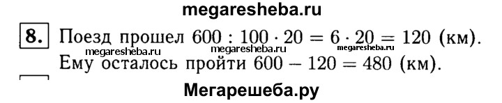 8. Поезд прошел 20% всего пути. Сколько километров ему осталось пройти, если весь путь равен 600 км?