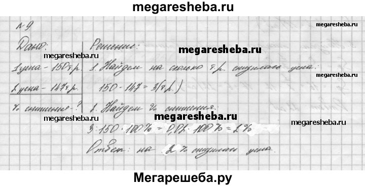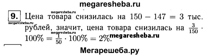 9. Цена товара снизилась со 150 тыс. рублей до 147 тыс. рублей. На сколько процентов снизилась цена товара?