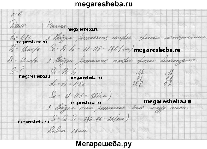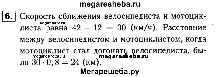 6. Мотоциклист догнал велосипедиста через 0,8 ч. Скорость велосипедиста 12 км/ч, а скорость мотоциклиста 42 км/ч. Какое расстояние было между ними, когда мотоциклист стал догонять велосипедиста?