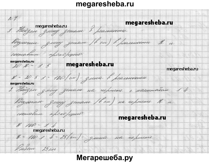 7. Деталь на чертеже, выполненном в масштабе 1:5, имеет длину 20 см. Какую длину будет иметь эта деталь на чертеже, масштаб которого 1:4?