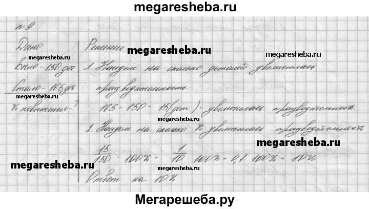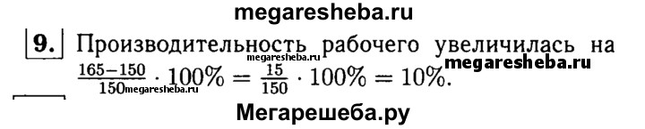 9. Рабочий стал изготовлять за смену вместо 150 деталей 165 таких же деталей. На сколько процентов увеличилась производительность рабочего?