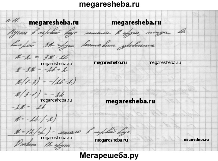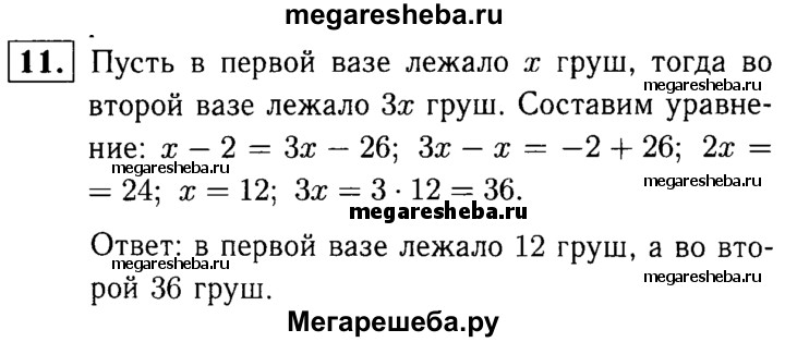 11. Составьте уравнение для решения задачи: «В первой вазе Рис. 34 лежало груш в 3 раза меньше, чем во второй. Если из первой вазы взять 2 груши, а из второй взять 26 груш, то груш в вазах будет поровну. Сколько груш лежало в первой вазе?» Решите составленное уравнение.