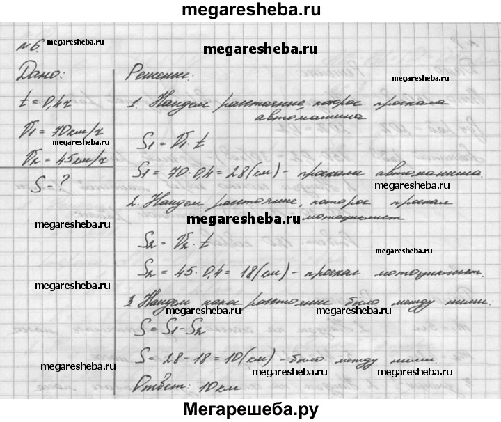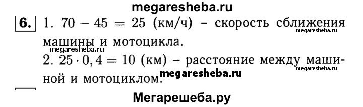 6. Автомашина догнала мотоциклиста через 0,4 ч. Скорость автомашины 70 км/ч, а скорость мотоциклиста 45 км/ч. Какое расстояние было между ними, когда автомашина стала догонять мотоциклиста?