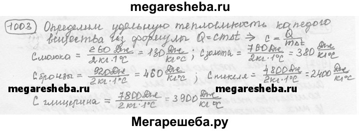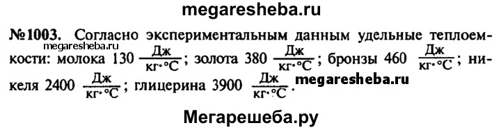 1003. Для нагревания на 1 °С молока и тел из золота, бронзы, никеля, глицерина массами по 2 кг каждое соответственно расходуется 260, 760, 920, 4800 и 7800 Дж энергии. Чему равна удельная теплоемкость этих веществ?