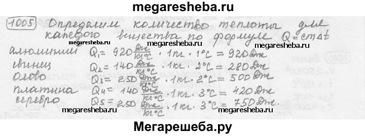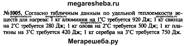 1005. Определите (устно), какое количество теплоты потребуется для изменения температуры алюминия на 1 °С; свинца на 2 °С; олова на 2 °С; платины на 3 °С; серебра на 3 °С, если масса каждого вещества 1 кг.