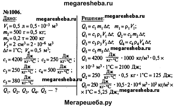 1006. Какое количество теплоты потребуется для нагревания на 1 °С воды объемом 0,5 л; олова массой 500 г; серебра объемом 2 см3; стали объемом 0,5 м3; латуни массой 0,2 т?