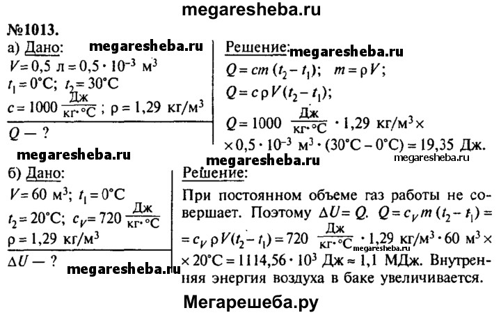 1013. а) Воздух, заполняющий объем 0,5 л в цилиндре с легким поршнем, нагрели от 0 до 30 °С при постоянном атмосферном давлении. Какое количество теплоты получил воздух? б) В порожнем закрытом металлическом баке вместимостью 60 м3 под действием солнечного излучения воздух нагрелся от 0 до 20 °С. Как и на сколько изменилась внутренняя энергия воздуха в баке? (Удельная теплоемкость воздуха при постоянном объеме равна 720 Дж/кг-°С.)