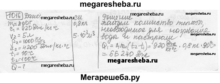1016. В алюминиевой кастрюле, масса которой 800 г, нагрели 5 л воды от 10 °С до кипения. Какое количество теплоты получили кастрюля и вода, если при нагревании атмосферное давление равнялось 760 мм рт. ст.?