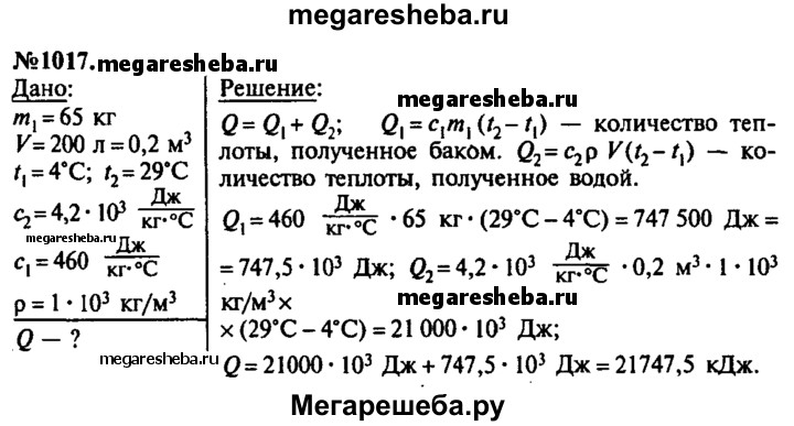 1017. В железный душевой бак, масса которого 65 кг, налили холодной колодезной воды объемом 200 л. В результате нагревания солнечным излучением температура воды повысилась от 4 до 29 °С. Какое количество теплоты получили бак и вода?