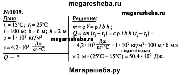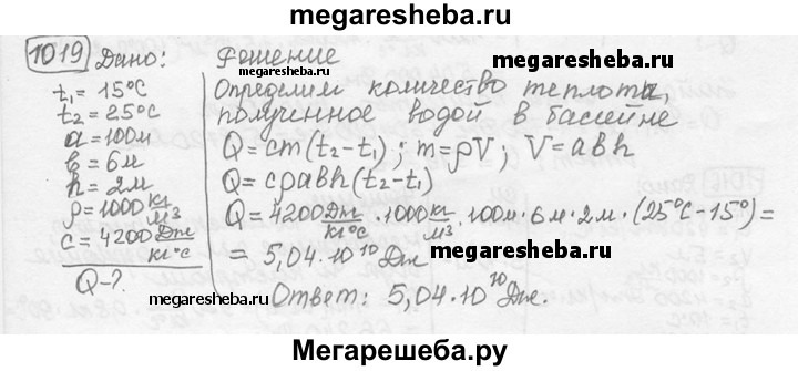 1019. Какое количество теплоты получила вода при нагревании от 15 до 25 °С в бассейне, длина которого 100 м, ширина 6 м и глубина 2 м?