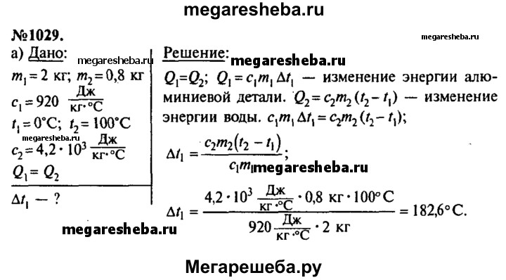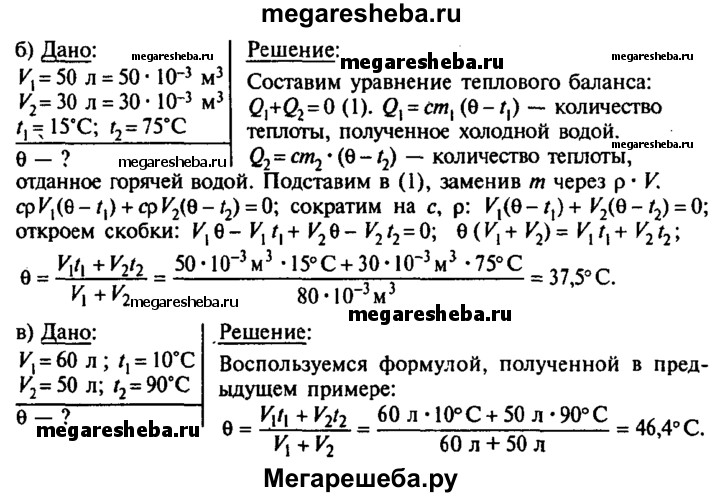 1029. а) Было установлено, что при работе машины внутренняя энергия одной из алюминиевых деталей массой 2 кг повысилась на столько, на сколько увеличилась внутренняя энергия воды массой 800 г при нагревании ее от 0 до 100 °С. По этим данным определите, на сколько градусов повысилась температура детали. б) В ванну налили и смешали 50 л воды при температуре 15 °С и 30 л воды при температуре 75 °С. Вычислите, какой стала бы температура воды в ванне, если бы некоторая часть внутренней энергии горячей воды не расходовалась на нагревание ванны и окружающей среды. в) Пренебрегая потерями теплоты на нагревание ванны и иных тел окружающей среды, вычислите, какой стала бы температура воды в ванне, если в нее налить шесть ведер воды при температуре 10 °С и пять ведер воды при температуре 90 °С. (Вместимость ведра примите равной 10 л.)