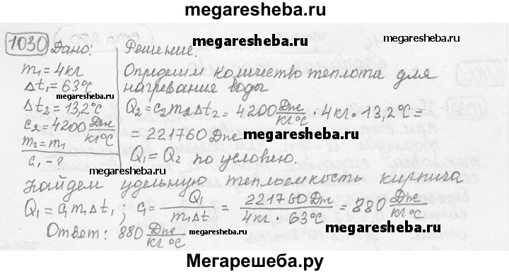 1030. На нагревание кирпича массой 4 кг на 63 °С затрачено такое же количество теплоты, как и на нагревание воды той же массы на 13,2 °С. Определите удельную теплоемкость кирпича.