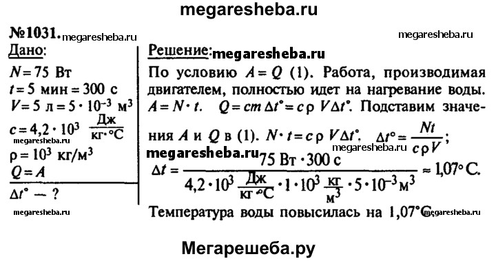 1031. Двигатель мощностью 75 Вт в течение 5 мин вращает лопасти винта внутри калориметра, в котором находится вода объемом 5 л. Вследствие трения о воду лопастей винта вода нагрелась. Считая, что вся энергия пошла на нагревание воды, определите, как изменилась ее температура.