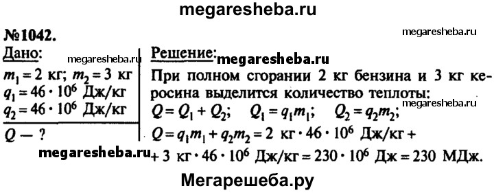 1042. Смешали бензин массой 2 кг и керосин массой 3 кг. Какое количество теплоты выделится при полном сгорании полученного топлива?