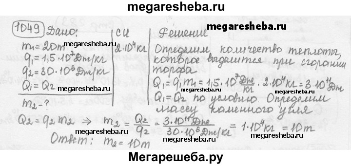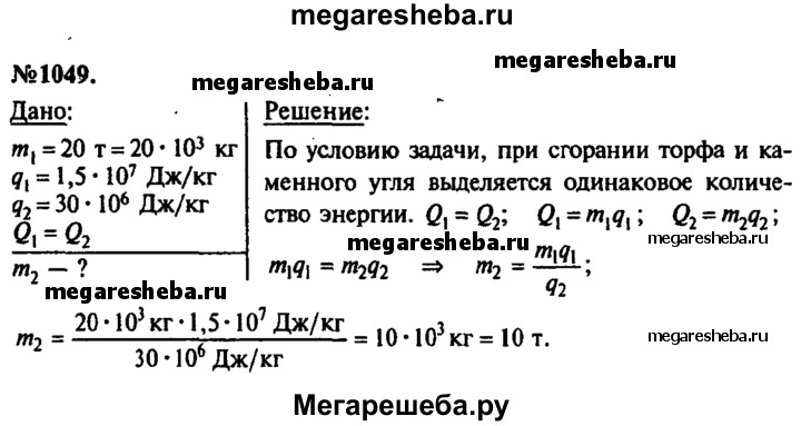 1049. В топке котла парового двигателя сожгли торф массой 20 т. Какой массой каменного угля можно было бы заменить сгоревший торф? (Удельную теплоту сгорания торфа принять равной 1,5- 107 Дж/кг.)