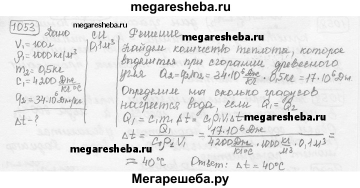 1053. На сколько изменится температура воды объемом 100 л, если считать, что вся теплота, выделяемая при сжигании древесного угля массой 0,5 кг, пойдет на нагревание воды?