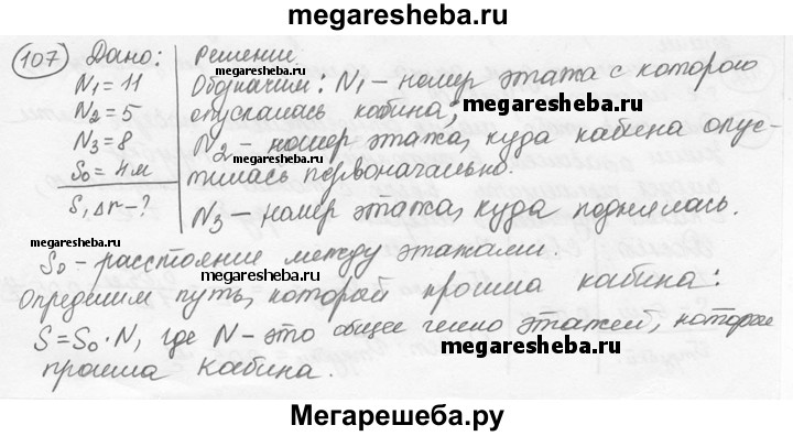 107. Кабина лифта опустилась с одиннадцатого этажа здания на пятый, а затем поднялась на восьмой этаж. Считая, что расстояния меж- 0 ДУ этажами равны по 4 м, определите путь и перемещение кабины. Какой знак имеет проекция вектора перемещения на ось, направленную вертикально вверх?