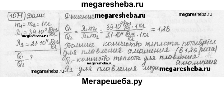 1071. Алюминиевый и медный бруски массой 1 кг каждый нагреты до температуры их плавления. Для плавления какого тела потребуется больше количества теплоты? На сколько больше?