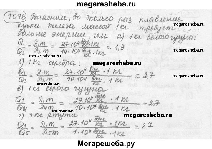 1076. Во сколько раз плавление куска железа массой 1кг требует больше энергии, чем плавление той же массы белого чугуна, серебра, серого чугуна и ртути, нагретых до своей температуры плавления?