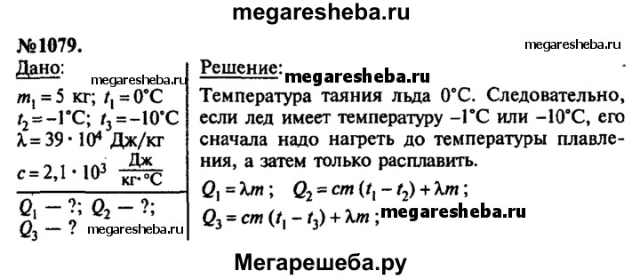 1079. Какое количество теплоты поглощает при плавлении лед массой 5 кг, если начальная температура льда 0; -1; -10 °С?