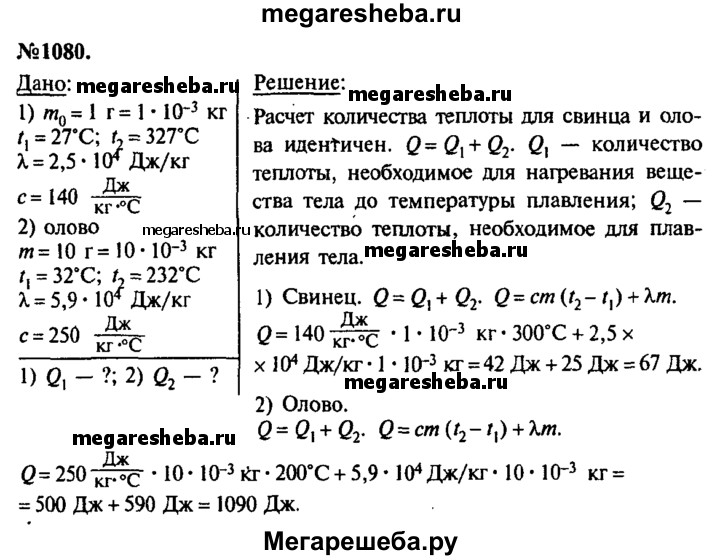 1080. Какое количество теплоты поглощает при плавлении кусок свинца массой 1 г, начальная температура которого 27 °С; олова массой 10 г, взятого при температуре 32 °С?