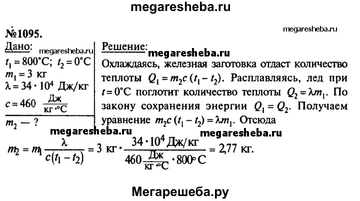 1095. Железная заготовка, охлаждаясь от температуры 800 до 0 °С, растопила лед массой 3 кг, взятый при 0 °С. Какова масса заготовки, если вся энергия, выделенная ею, пошла на плавление льда?