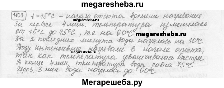 1107. На рисунке 272 построен график нагревания воды по данным, полученным учащимися. Ответьте на вопросы: при какой температуре воды учащиеся начали отсчитывать время нагревания? На сколько градусов изменилась температура воды за первые 4 мин? На сколько градусов возросла температура воды за последние 2 мин наблюдения? Когда воду нагревали интенсивнее: в начале или в конце опыта? Какую температуру имела вода в конце четвертой минуты? Через сколько минут после начала опыта вода нагрелась до 60 °С?
