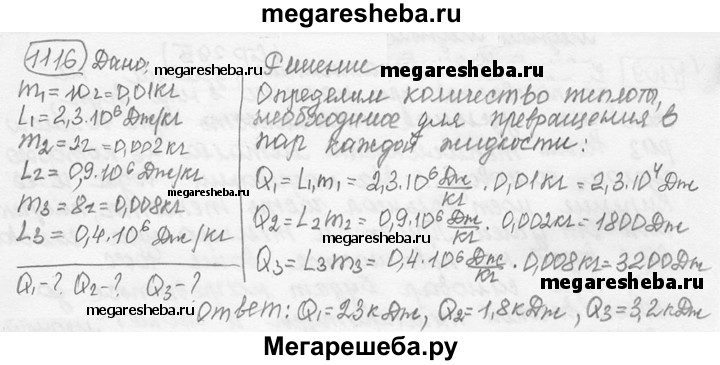 1116. Какое количество теплоты необходимо для обращения в пар воды массой 10 г, спирта массой 2 г, эфира массой 8 г, если каждая жидкость нагрета до температуры кипения?
