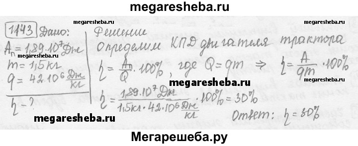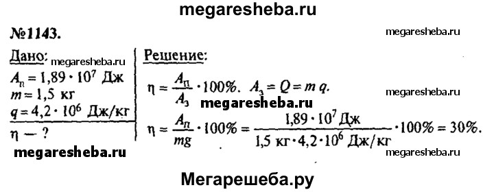 1143. Определите КПД двигателя трактора, которому для выполнения работы 1,89 • 107 Дж потребовалось 1,5 кг топлива с удельной теплотой сгорания 42- 106 Дж/кг.
