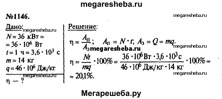 1146. Двигатель внутреннего сгорания мощностью 36 кВт за 1 ч работы израсходовал 14 кг бензина. Определите КПД двигателя.
