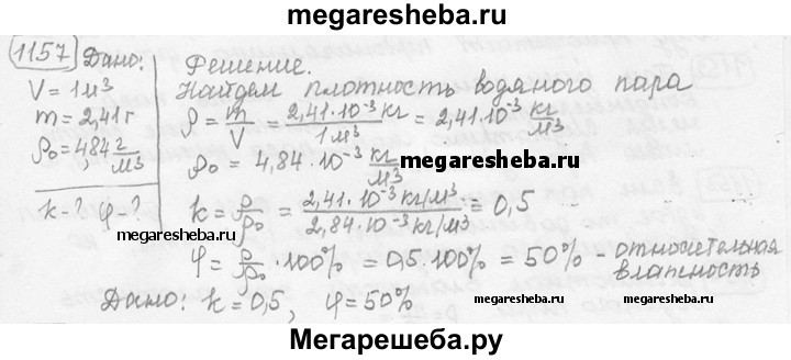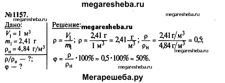1157. В объеме воздуха 1 M;i при нормальных условиях содержится влага массой 2,41 г. Какую долю и какой процент составляет это количество по сравнению с тем количеством влаги, которое содержал бы этот же воздух в объеме 1 м3, если бы пар был насыщающим?