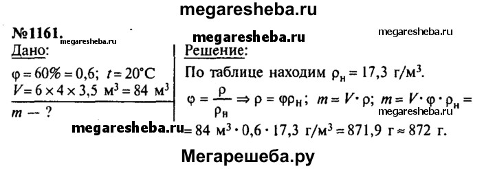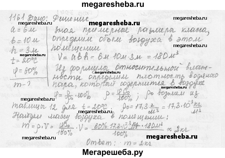 1161. Пользуясь таблицей 10, определите, сколько воды в виде пара содержится в воздухе вашего классного помещения при температуре 20 °С и относительной влажности воздуха 60%.