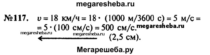 117. Муха летит со скоростью 18 км/ч. Выразите эту скорость в сантиметрах в секунду (см/с); метрах в секунду (м/с). Последнюю скорость изобразите графически (стрелкой), полагая, что муха летит в направлении с востока на запад (масштаб: 1 м/с — 0,5 см).