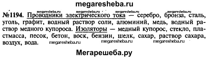 1194. Из материалов, перечисленных ниже, укажите, что относится к проводникам, а что к изоляторам: серебро, бронза, медный купорос, уголь, стекло, сталь, графит, пластмасса, водный раствор соли, песок, бетон, воск, алюминий, медь, бензин, шелк, сахар, раствор сахара, воздух, вода, водный раствор медного купороса.