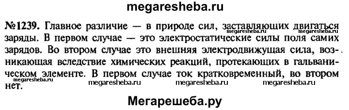 1239. В чем состоит главное различие между током, возникшим в металлическом проводнике, с помощью которого разряжают электроскоп, и током, текущим по проводнику, соединяющему полюсы гальванического элемента?