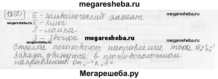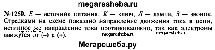 1250. Рассмотрите схему электрической цепи, изображенную на рисунке 300. Назовите составные части цепи, обозначенные буквами Е, К, Л, 3. Что обозначают стрелки на схеме? Каково истинное направление движения зарядов в цепи?