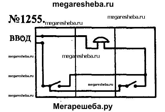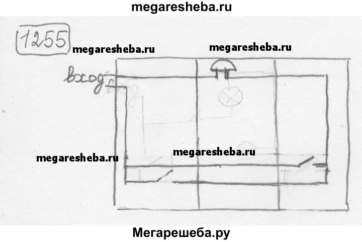 1255. На рисунке 303 изображена развернутая схема расположения стен комнат, где указаны ввод тока, расположение звонка и кнопок. Сделайте рисунок в тетради и начертите схему прокладки проводов так, чтобы можно было включать звонок из каждой комнаты.