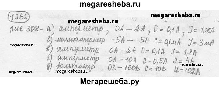 1262. На рисунке 308 изображены шкалы электроизмерительных приборов. Как называются эти приборы? Каковы пределы измерения приборов? Какова цена деления шкалы каждого прибора? Каковы их показания?