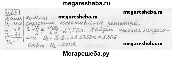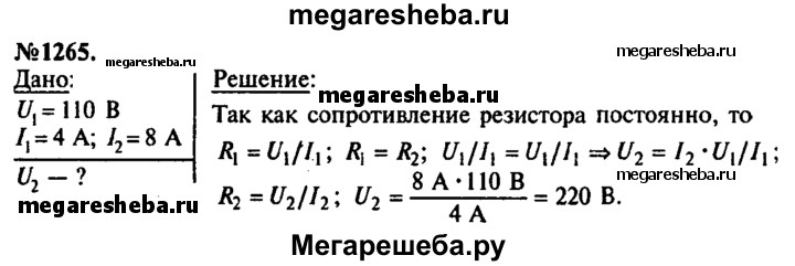 1265. При напряжении на резисторе, равном 110 В, сила тока в нем равна 4 А. Какое напряжение следует подать на резистор, чтобы сила тока в нем стала равной 8 А?