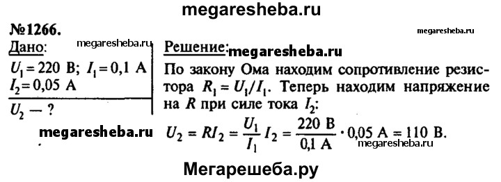 1266. При напряжении 220 В на зажимах резистора сила тока равна 0,1 А. Какое напряжение подано на резистор, если сила тока в нем стала равной 0,05 А?